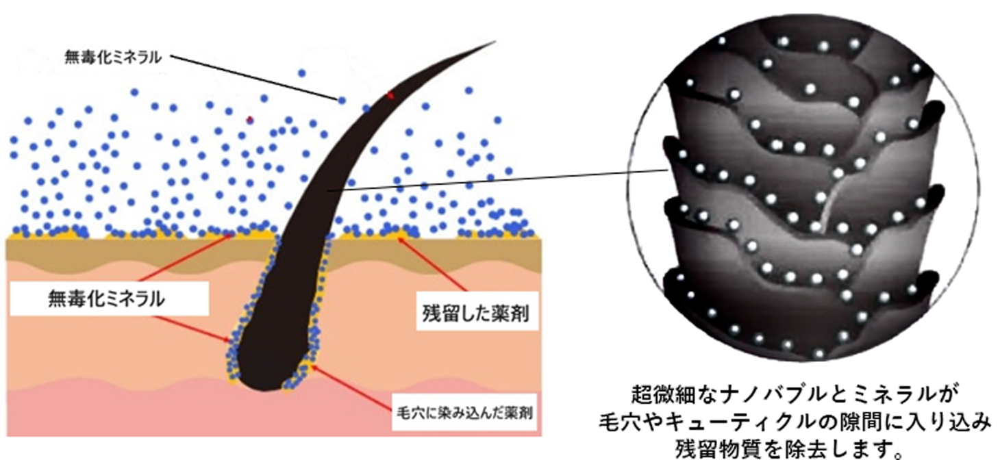 無毒な状態にします。(反応できない安定した状態)・カラーの後処理で発色の促進、ジアミンなどのアルカリ剤無毒化・パーマ、ストレートの中間処理にて1剤の除去